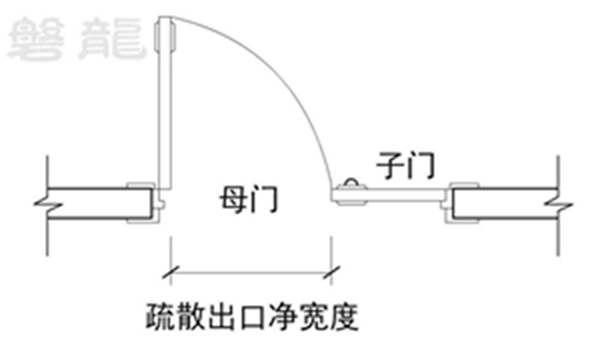 子母门是一种特殊类型的双扇门,由一个宽度较宽的门扇(母门)和一个宽度较窄的门扇(子门)构成,当子门采用手动锁具(插销锁)时,子门门扇的宽度不应计入疏散宽度,疏散出口门的净宽度应为子门门扇边缘至母门门扇开启 90°后的门内表面的水平距离。