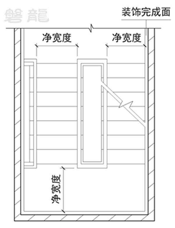 疏散楼梯的净宽度,不得计入梯裙、栏杆、扶手、障碍物(柱等突出物)及装饰涂层的厚度【图示6】
