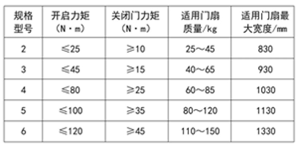 (1)依据《防火门闭门器》XF93-2004第4.2节规定,防火门闭门器规格应符合表1规定: