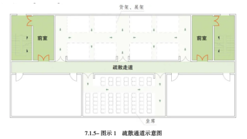 (1)危险区域:未设置围护结构但具备疏散功能的通道,例如由营业厅货架、展览厅展架、观众厅坐席等分隔形成的人员通道;