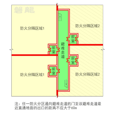 疏散走道是疏散通道的一部分,通常指从房间疏散门至安全出口之间的路径。疏散走道属于次危险区域【图示3】,其基本要求如下:
