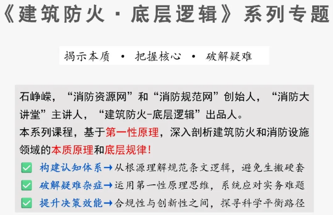 石峥嵘:《建筑防火·底层逻辑》系列专题——安全疏散-第7部分:双向、单向走道与疏散距离的适应原则及应用。理解双向、单向走道的规范适应原则,可系统解决走道的疏散距离问题。 基于第一性原理,深入剖析建筑防火和消防设施领域的本质原理和..